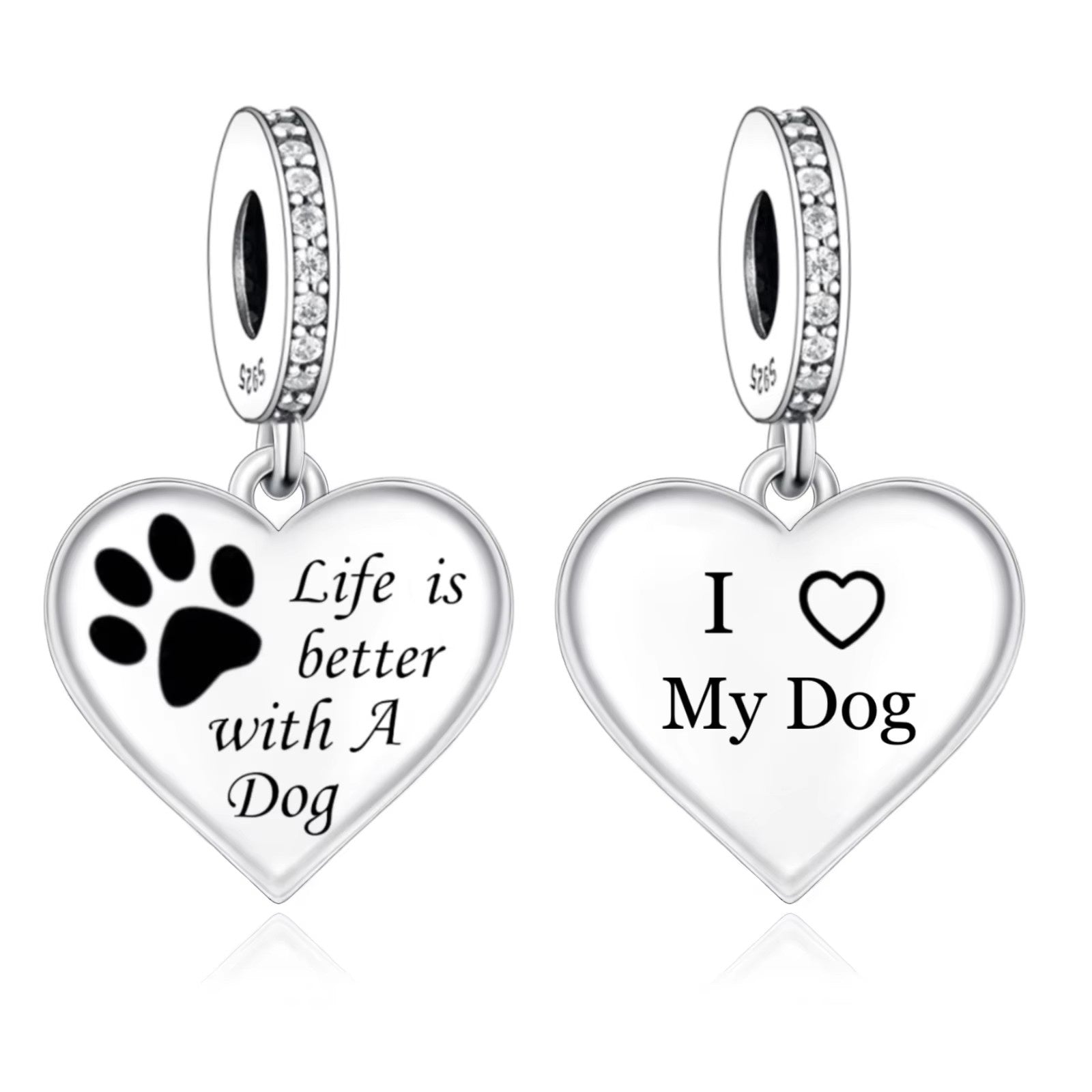 - Design: Sterling silver heart dog tag charm engraved "Life is better with a dog" and I love my dog" on the back.