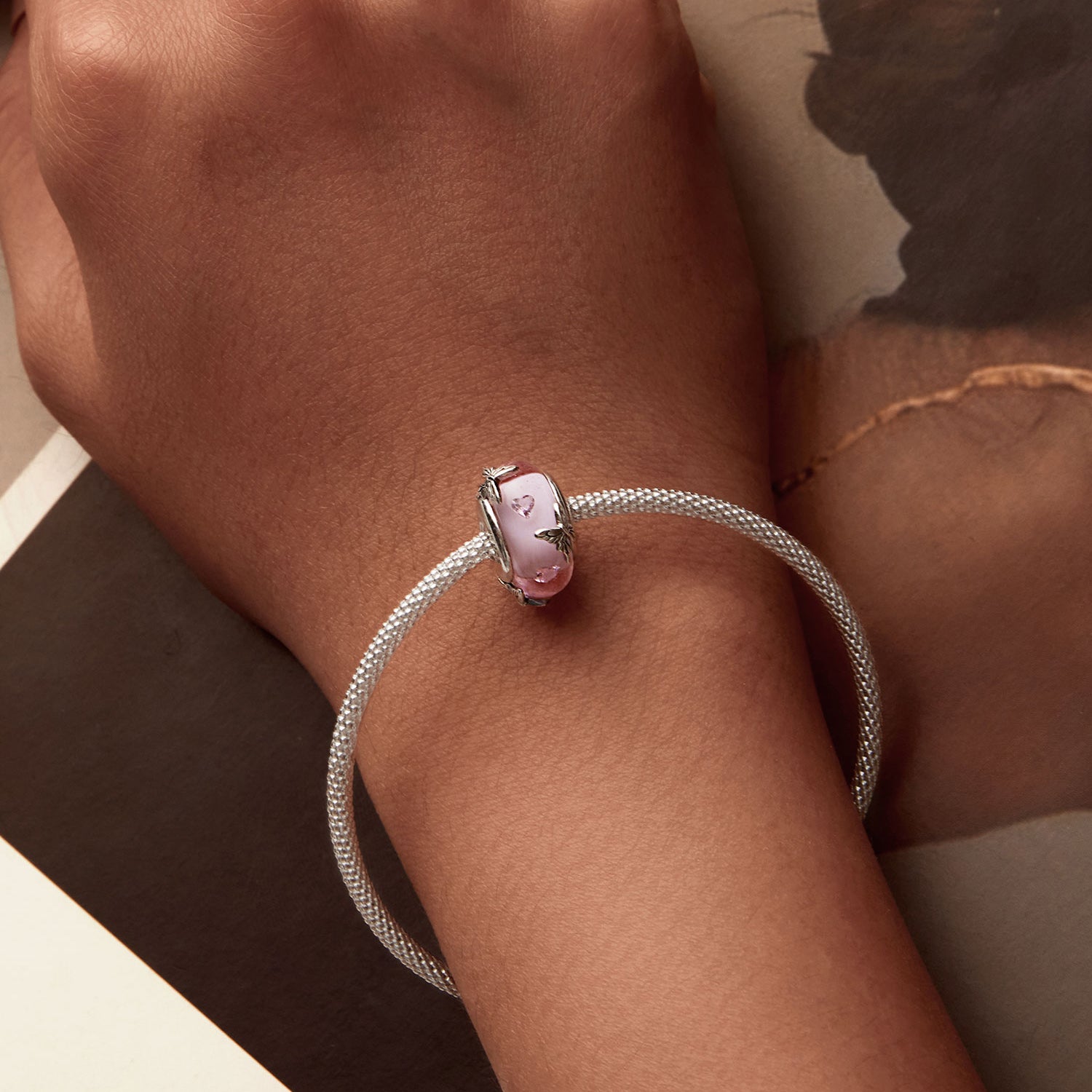- Design: Sweet pink core glass charm with CZ hearts and butterflies