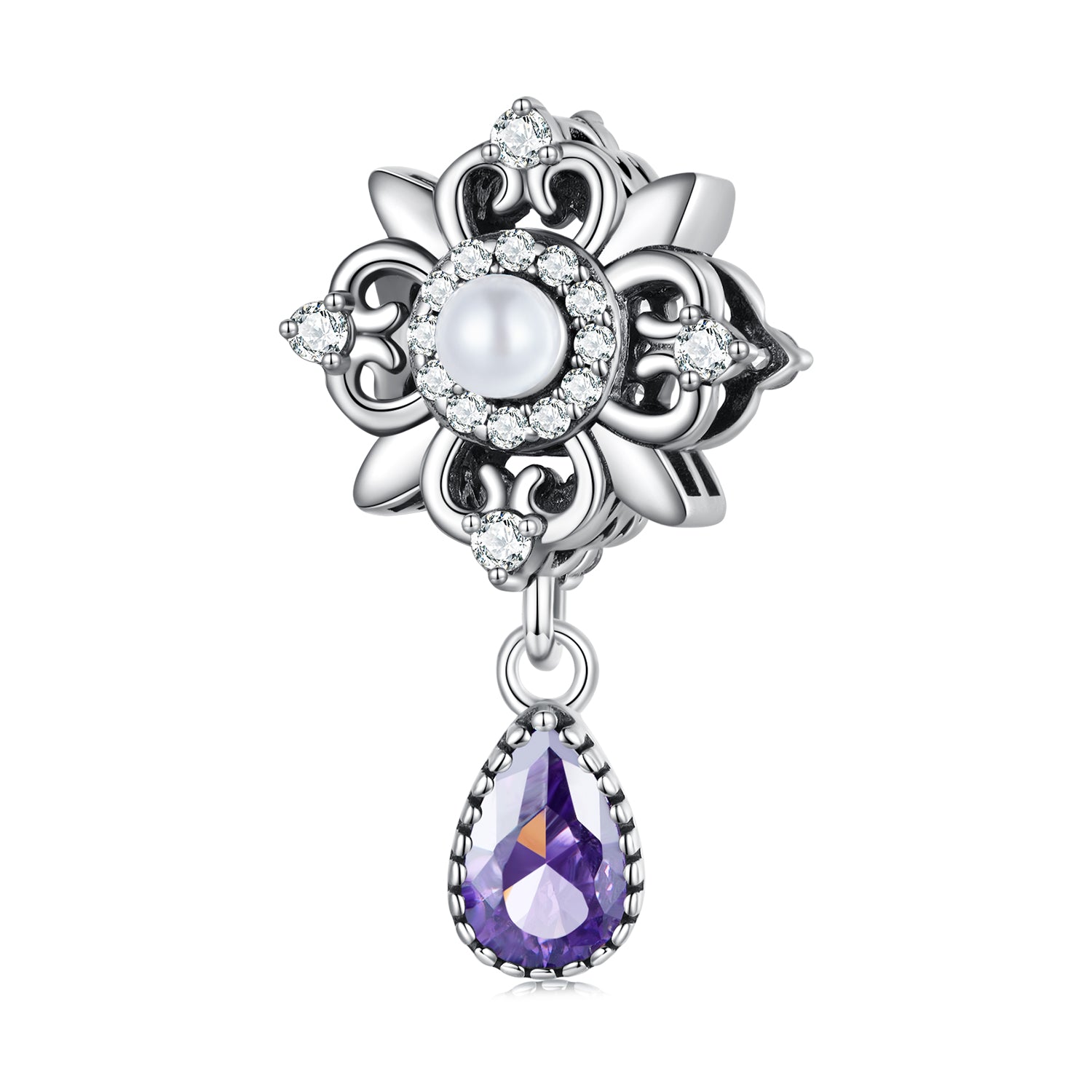 SOLID Sterling Silver Purple Vintage Lace Flower Pearl Charm Pendant - AVILIA Designs