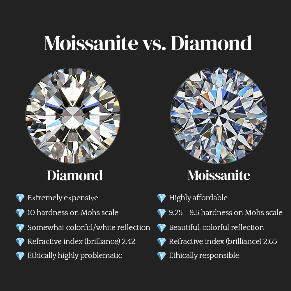 Additionally, lab-grown moissanite offers a more budget-friendly option without compromising on quality or aesthetic appeal. With its exceptional hardness, brilliance, and fire comparable to natural diamonds, moissanite represents an economically viable choice that allows you to acquire a stunning, durable gemstone without the high price tag often associated with traditional diamonds.