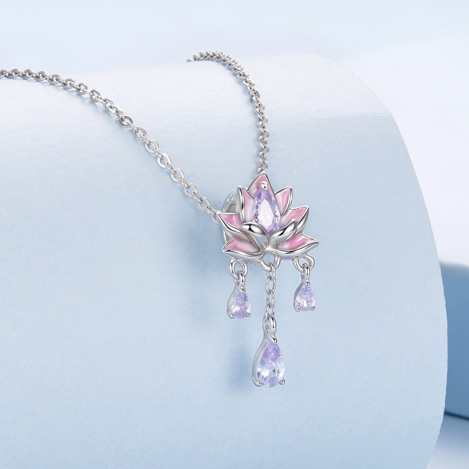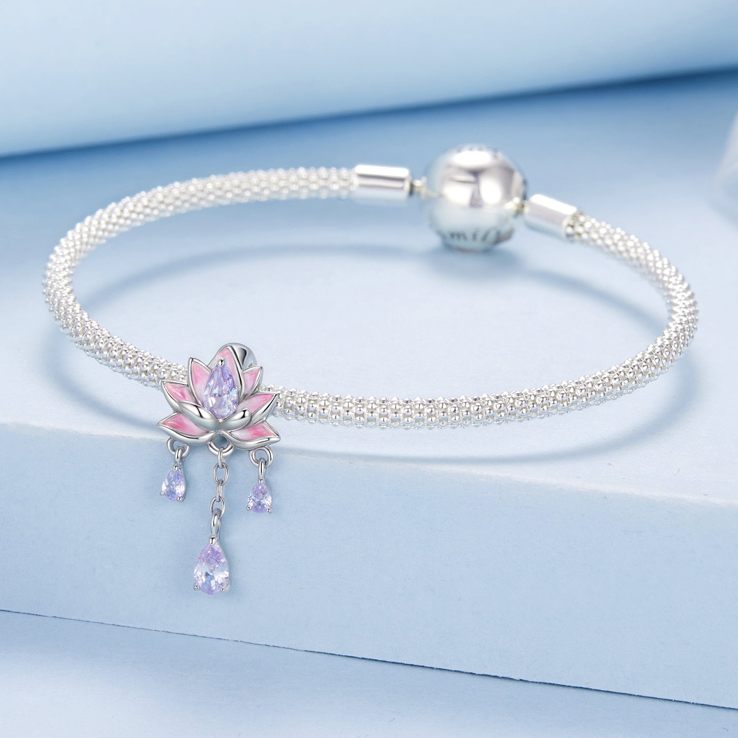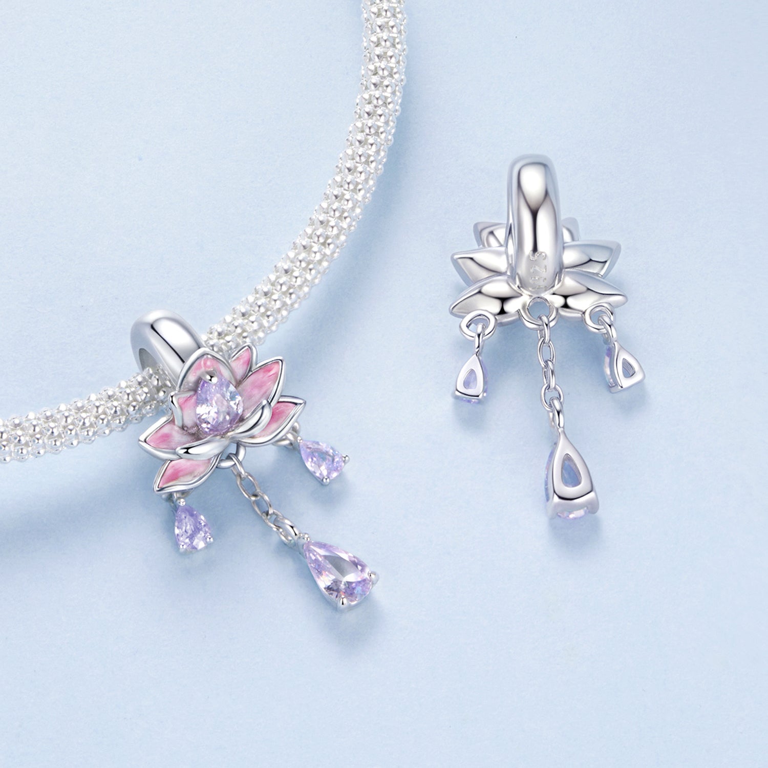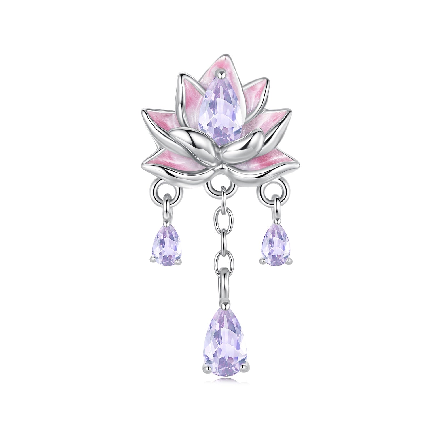 - Design: Sterling silver non-slip backing pink blooming lotus with purple CZ charm.